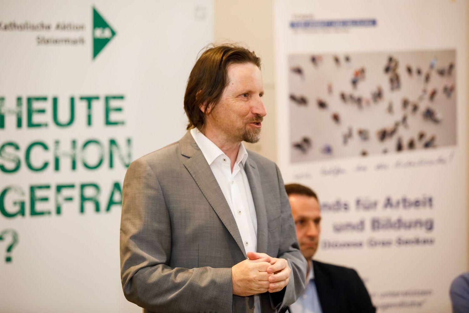 Grußworte von Anna Hollwöger, Katholische Aktion Steiermark, und Peter Hochegger, Fonds für Arbeit und Bildung, eröffneten den Abend.