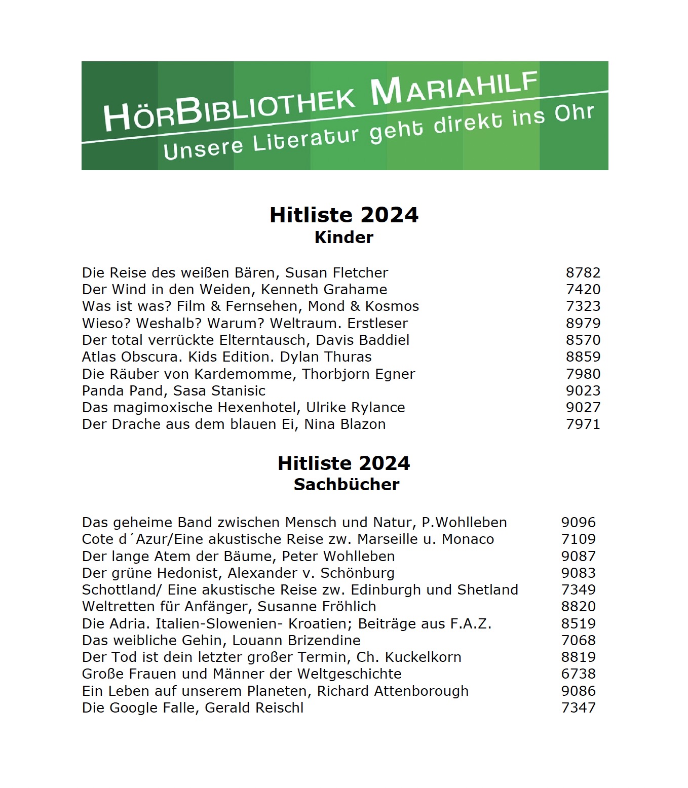 Wie zu Beginn jeden Jahres erstellt die HörBibliothek Mariahilf Listen der am öftesten entliehenen Hörbücher des abgelaufenen Jahres.