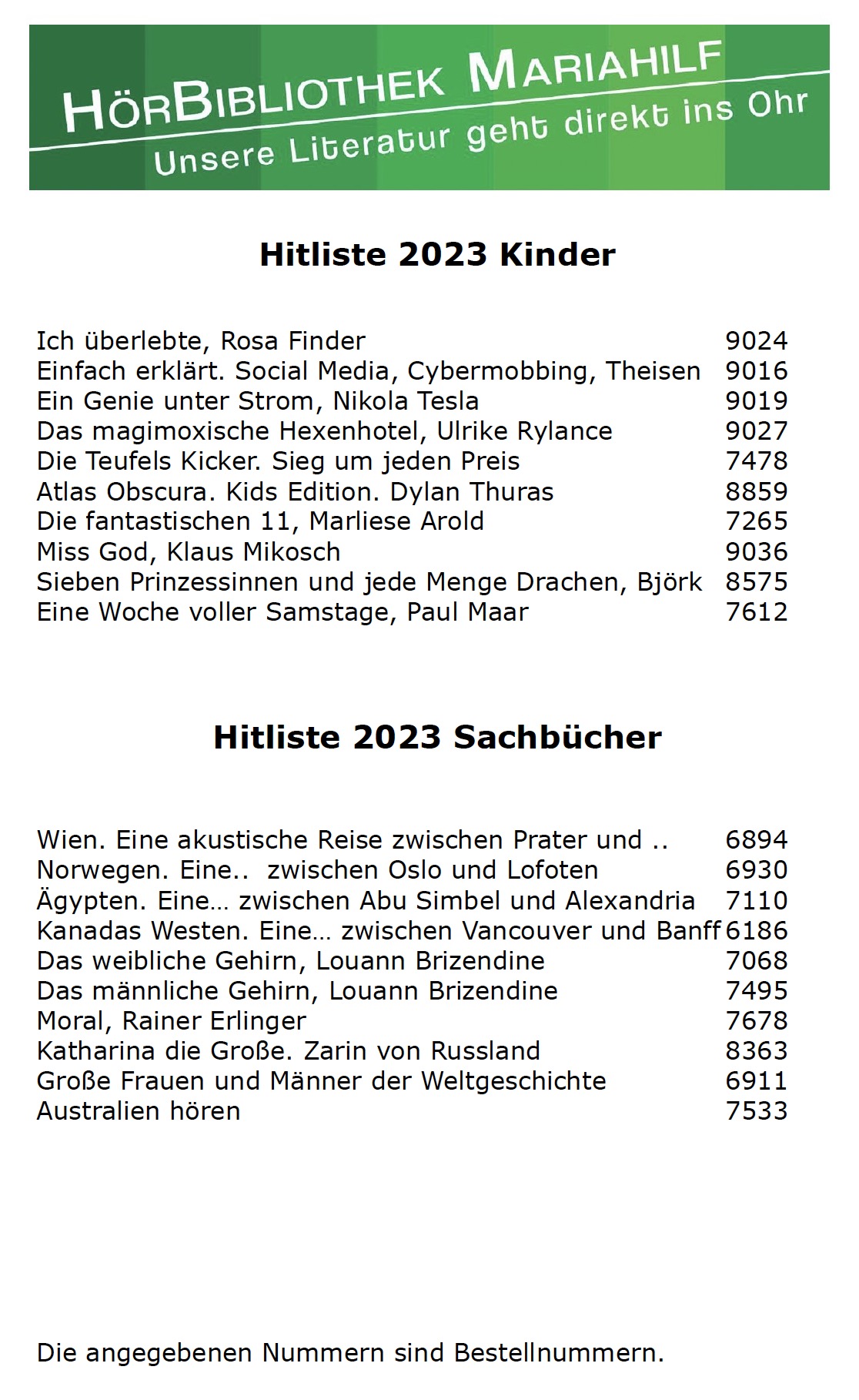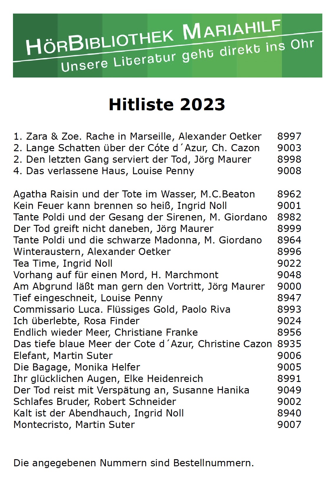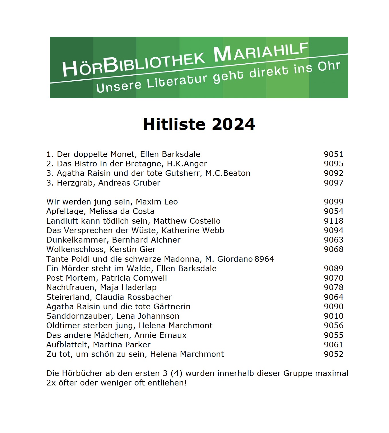Wie zu Beginn jeden Jahres erstellt die HörBibliothek Mariahilf Listen der am öftesten entliehenen Hörbüchern des abgelaufenen Jahres.