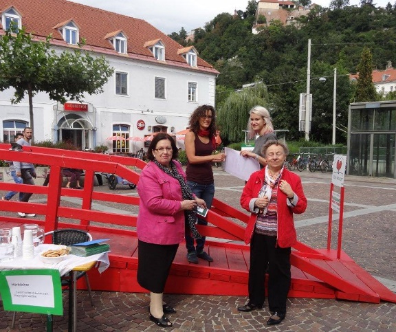 Die Aktion " Herzensbrücke - Sozial verbindet uns alle", die wegen der tragischen Ereignisse verschoben werden musste, wurde nun am 7. September 2015 auf dem Mariahilferplatz durchgeführt. Wir haben besonders auf unser soziales Engagement hingewiesen, dass nämlich blinde und sehbeeinträchtigte Menschen dank der Unterstützung durch das Sozialamt Graz gratis unsere Hörbücher (auch durch Blindenpost) erhalten können.