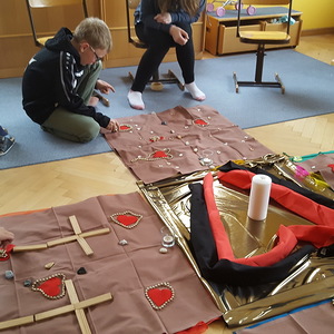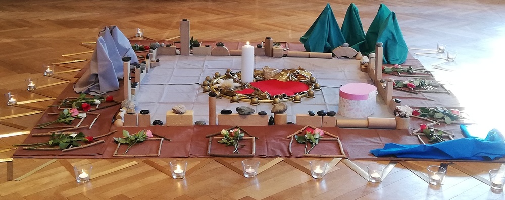 Gemeinsam mit den Kindern werden religiöse Inhalte und Schwerpunkte ohne Zeitdruck erarbeitet und anhand von Legematerialien zu wundervollen Bodenbildern gestaltet. Die Einheiten werden mit Liedern, Tänzen, bewussten Sinneswahrnehmungen und Geschichten gestaltet.