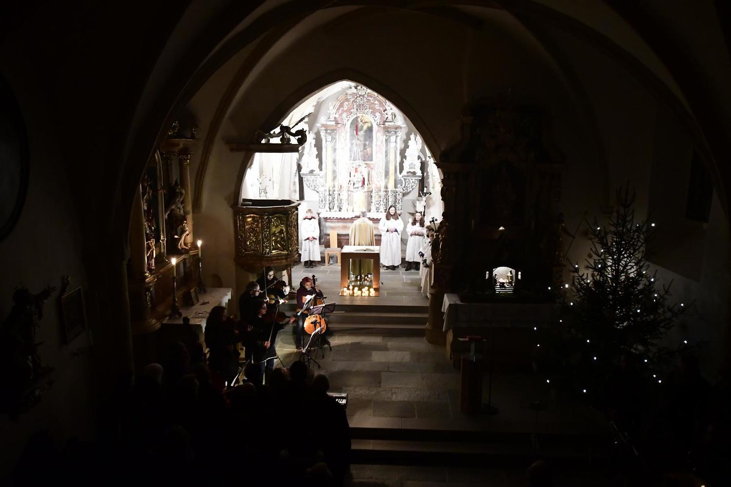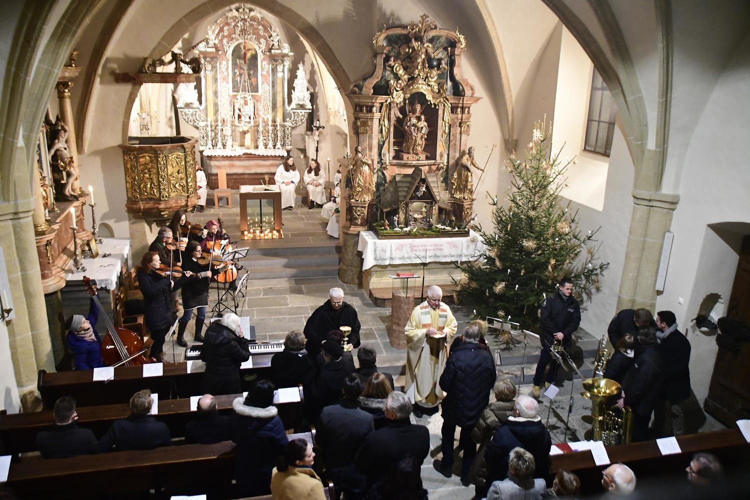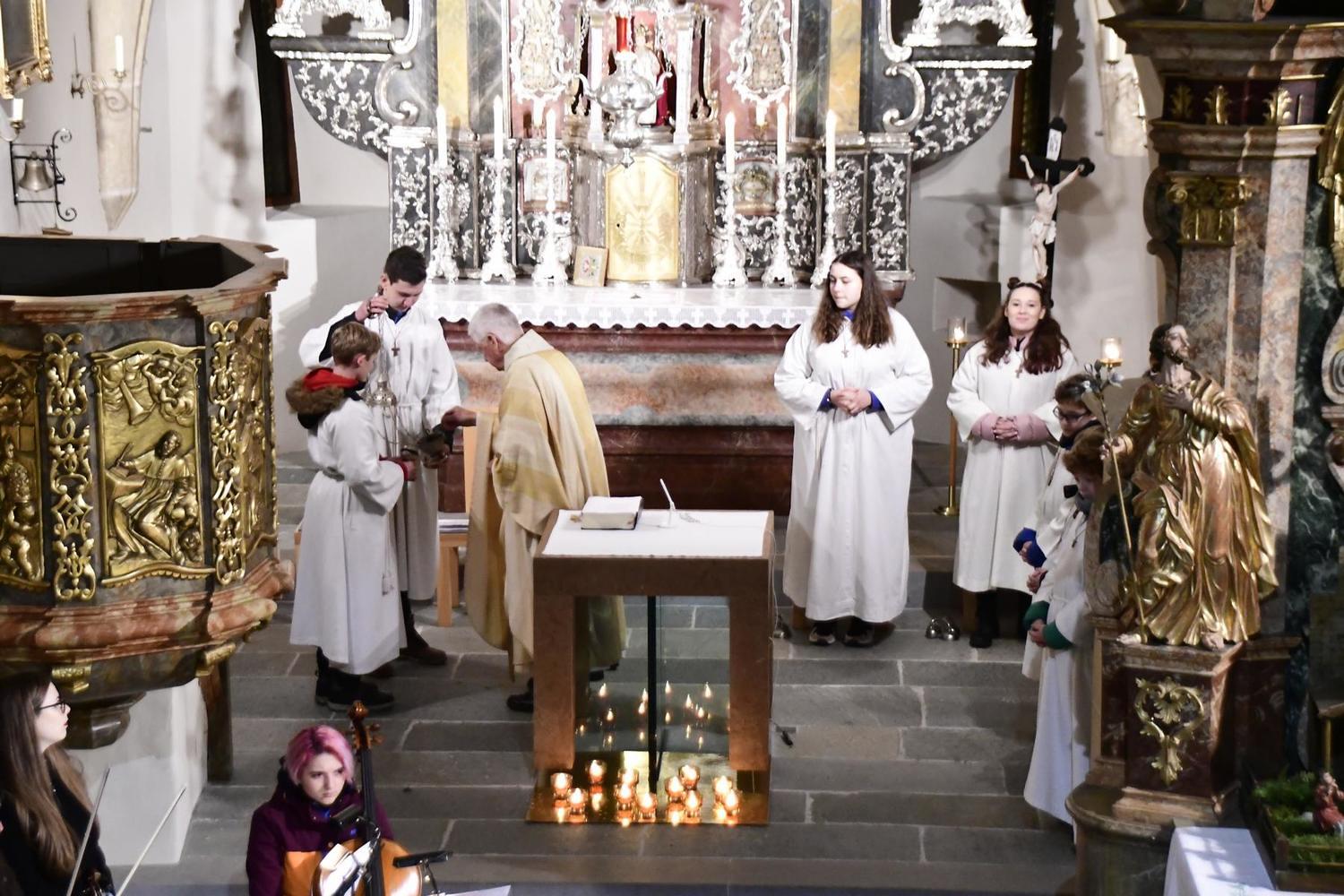 Am 24. Dezember wurde auf dem Kirchberg in Deutschfeistritz um 23.00 Uhr die Christmette gefeiert. Professor Mag. Helmut Schlacher als Zelebrant freute sich über die große Zahl an Kirchenbesuchern. Familie Härtel sang schon eine halbe Stunde vor Beginn des Gottesdienstes mit der ganzen Kirchengemeinde Hirten- und Krippenlieder. Inge Härtel übte für den Festgottesdienst ein vielstimmiges Gloria und ein Alleluja ein, an dem sich alle mit Freude beteiligten. Auch das Orchester und die Bläsergruppe musizierten mit großer Begeisterung. Die mit Sorgfalt ausgewählten Texte trugen zu einer besonderen Stimmung bei. So wurde die Mette sowohl musikalisch als auch spirituell zu einem Gemeinschaftserlebnis.