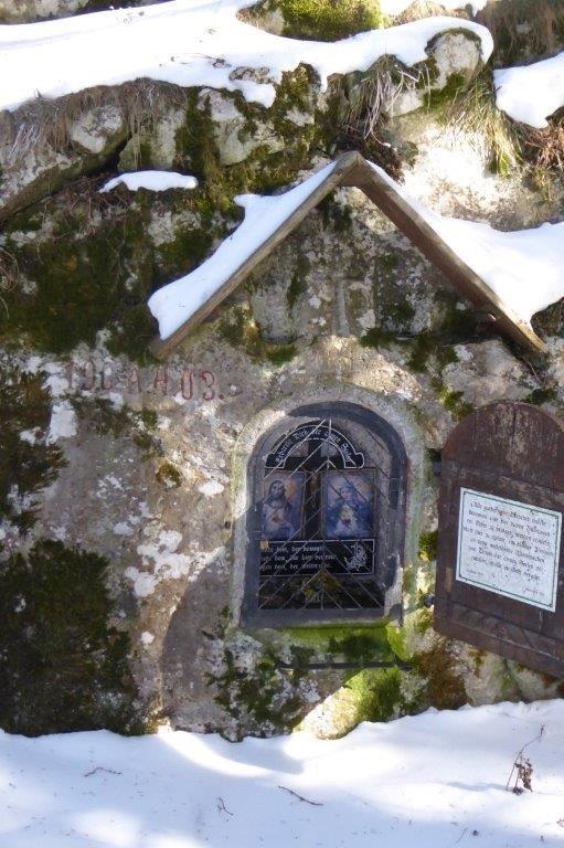Zum Schutze des Marterls vor Witterungseinflüssen wurde darüber ein einfaches Holzdach am Fels montiert und eine Holztür zum Verschließen angebracht. An deren Innenseite ist auf einer Tafel zu lesen: