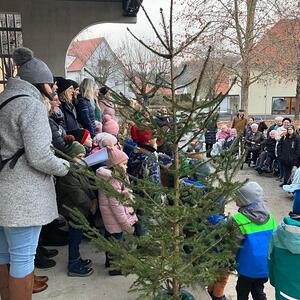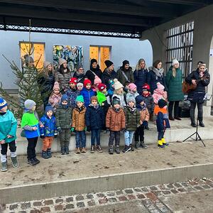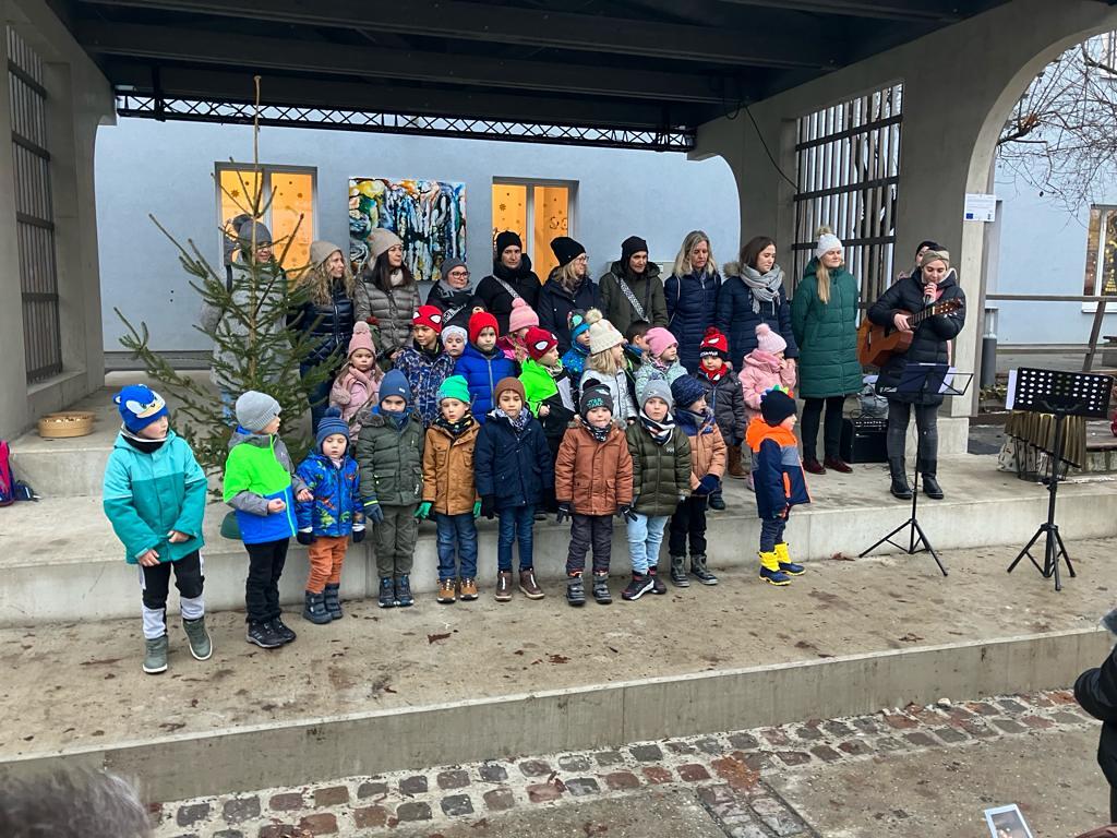 Die Kindergartenkinder gestalteten mit Ihren Betreuerinnen im Vorfeld des Nachmittags das 12. Adventfenster, das im Pfarrsaal ausgestellt wird. Alle freuten sich schon auf die gemeinsame Eröffnung des Fensters und versammelten sich am Peter-Paul-Platz. Mit Liedern und Geschichten, die die Kinder vortrugen wurde das Kunstwerk feierlich enthüllt.