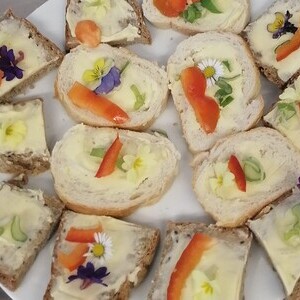 Viele schöne Gespräche und Begegnungen folgten bei guter Ver­pfle­gung. Be­son­ders ap­pe­tit­lich waren die Butter­brote aus selbst ge­back­en­em Schwarz­brot - bunt ver­ziert mit den ers­ten Blüten aus Gerti´s Garten. Auch ein Glaserl Wein durfte nicht fehlen und so fand der Nach­mittag einen ge­müt­lichen Aus­klang.