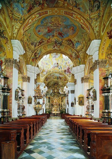 Wir treten durch das schöne Portal in die Kirche ein. Der Raum ist groß und eindrucksvoll. Die ganze Schönheit ist auf den Hochaltar verwendet und auch die Fresken geben der Kirche ihren prunkvollen Ausdruck.