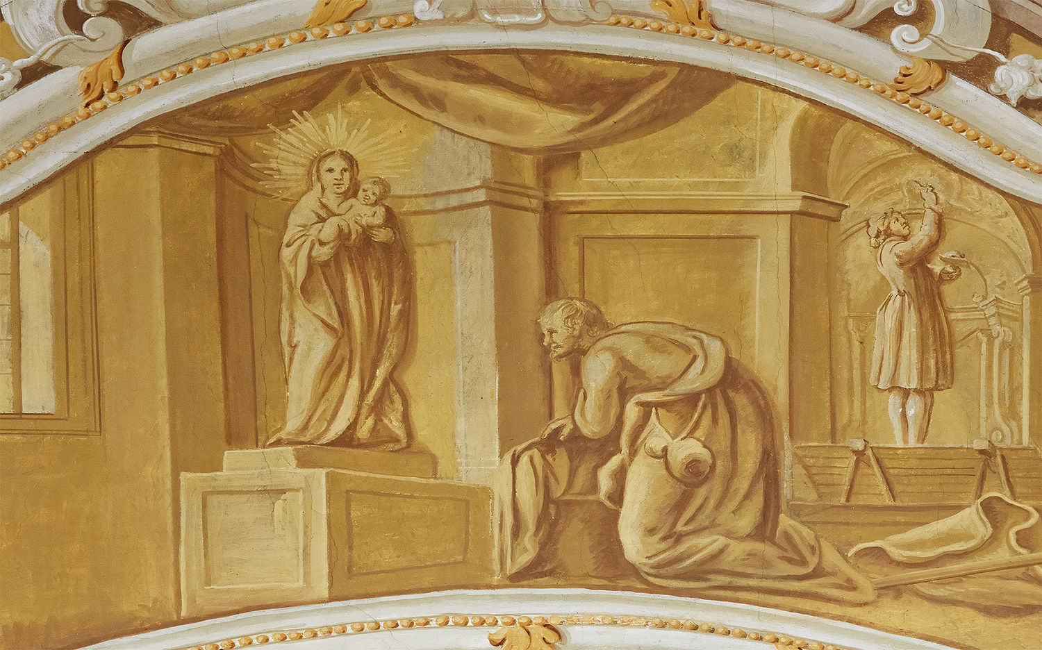 Im ersten Stock des Osttraktes, direkt hinter dem Hochaltar, im Vorraum zu den Oratorien befindet sich das sogenannte Stifterfresko. Das Fresko wurde von J. B. Scheidt 1747 gemalt und zeigt den Stifter des Gnadenortes Conduzzi mit einer Frau an einer Balkonbrüstung stehen. Sie übergeben die Stiftungsurkunde der von Engeln umgebenen "Mariatroster Madonna", die über ihnen schwebt. Im Hintergrund erhebt sich in einer Art Vision die strahlende Kirche Mariatrost.