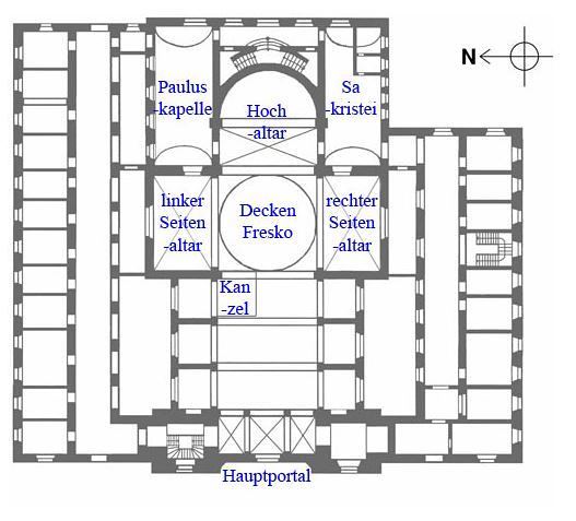 Links vom Altarraum befindet sich die Pauluskapelle. An der Decke wird im Fresko die "Verherrlichung des Hl. Paulus des Einsiedlers" dargestellt. Die Fresken stammen von Lukas Schramm aus dem Jahre 1736 und wurden 1910/20 von Felix Brazutti übermalt.