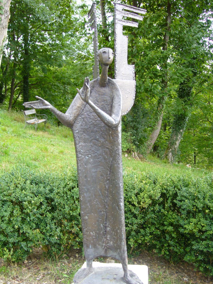 Kurz bevor man den Kirchplatz erreicht verweist ein Bronzeengel, der Erzengel Gabriel, gestaltet von Erwin Huber (2000) auf das Haus unserer Gottesmutter Maria.