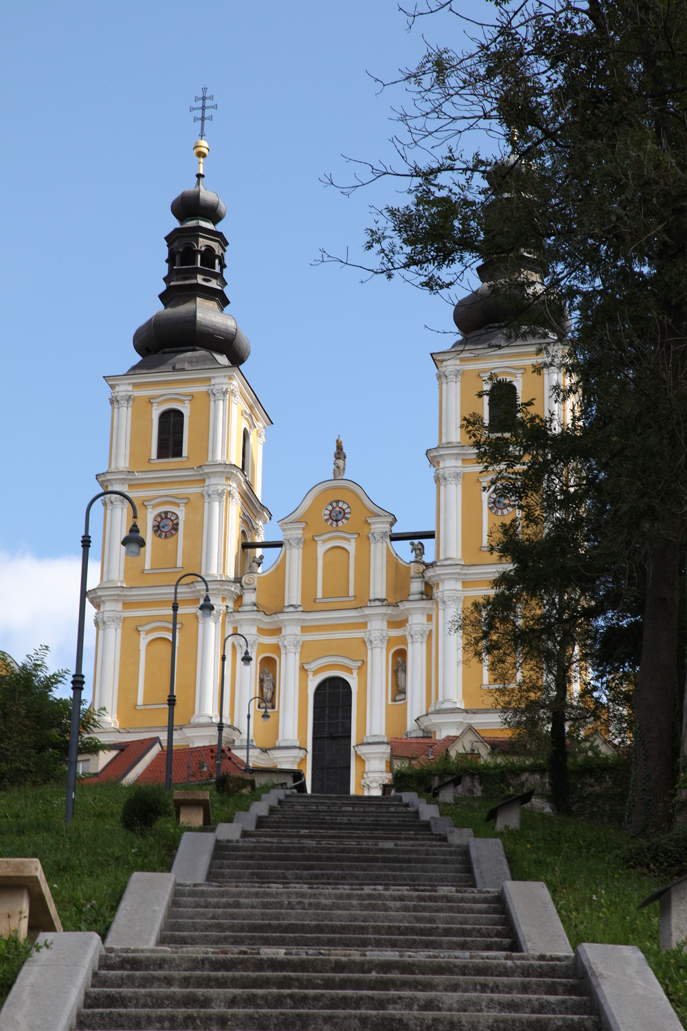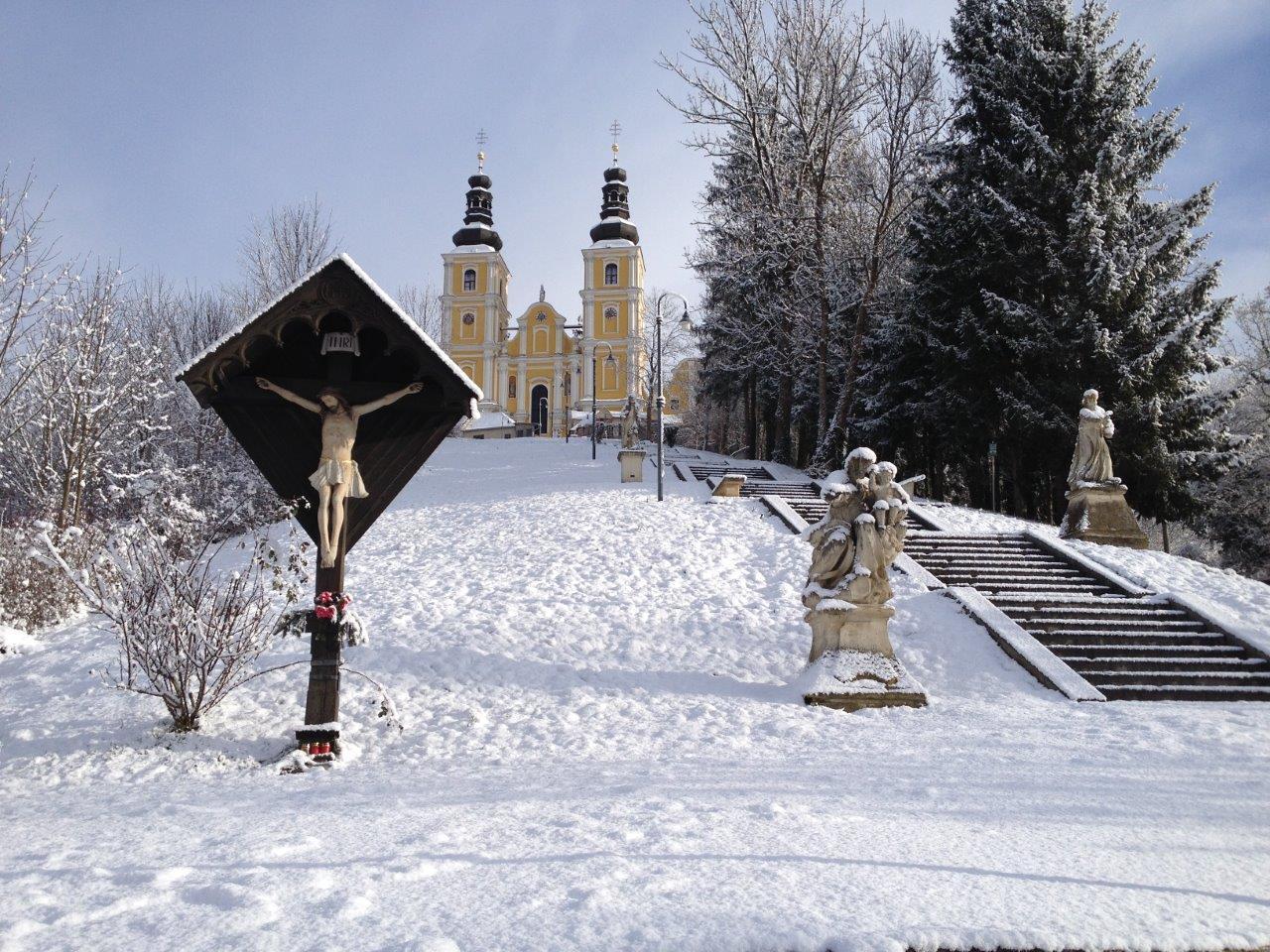 Der Aufstieg endet auf dem Kirchplatz und wir stehen vor dem Hauptportal. Schon durch einen goldenen Schriftzug über dem Hauptportal werden die Pilger eingeladen in das Gotteshaus einzutreten: "Gehet in das Haus eurer Mutter!"