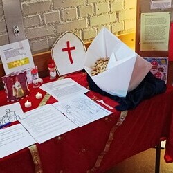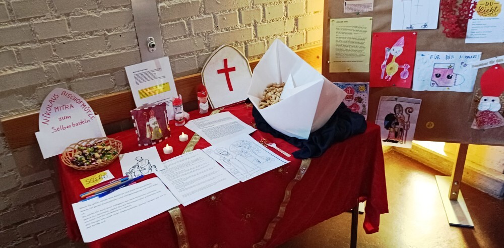 Bei der Nikolausstation in der Kirche gab es auch Feiervorschläge,  Ausmalbilder, Süßes und Nikolausmützen zum selber basteln.