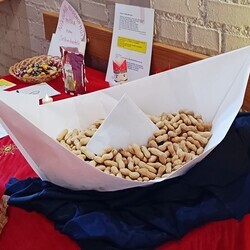 Bernadette Muhr erzählte lebendig die Nikolausegende von der Hungersnot in Myra. Von einem großen Schiff beladen mit Korn (Erdnüssen) durften die Kinder dann je eine Nuss für sich und eine zum Teilen mitnehmen.