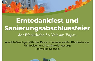 8. Oktober 2023, 09.00 Uhr Erntedankmesse anschl. herzliche Einladung zur Sanierungsabschlussfeier der Pfarrkirche St. Veit im Pfarrgarten!